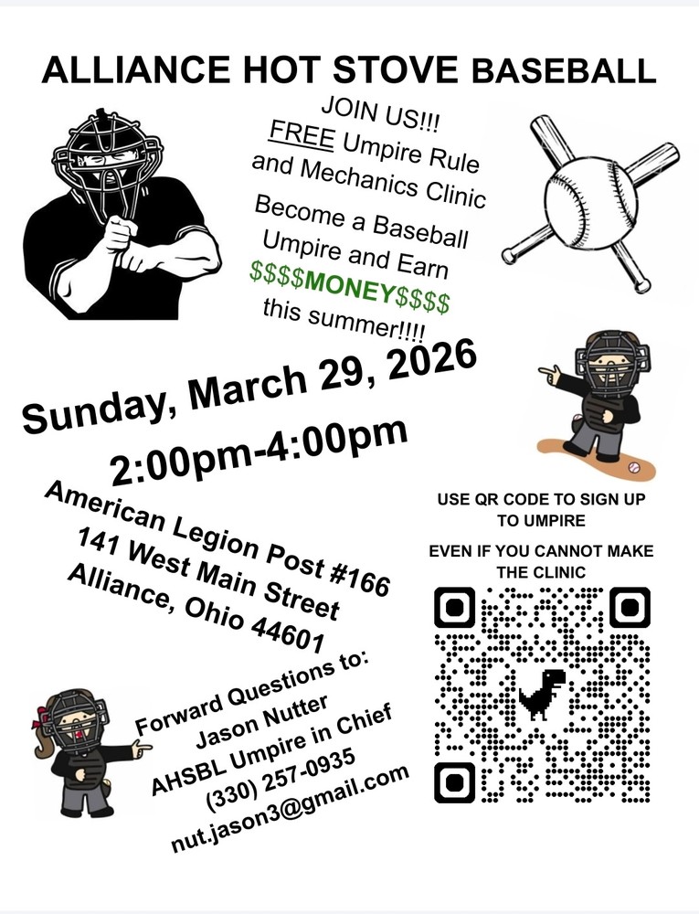 Sunday, March 29th, come to our free umpire clinic if you are interested in officiating games this season. See the flier for more details.